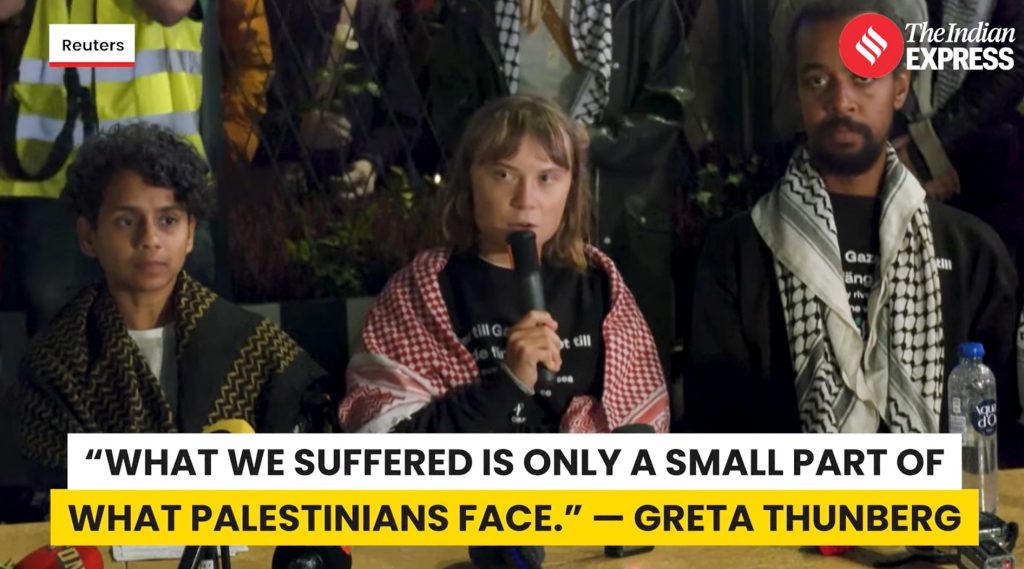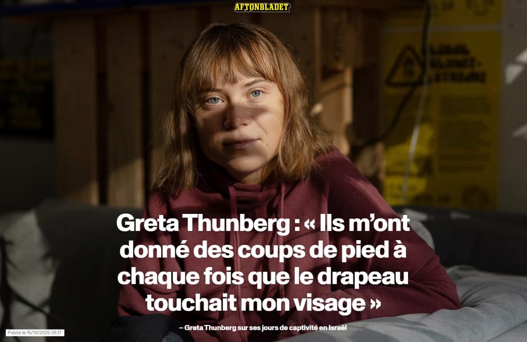 Dans une interview accordée au journal suédois Aftonbladet, Greta Thunberg a corroboré les témoignages oculaires précédents selon lesquels elle et ses compagnons militants de la Flottille mondiale Sumud ont été victimes d’abus monstrueux de la part des autorités israéliennes après avoir été enlevés de leurs bateaux transportant de l’aide humanitaire destinée aux Palestiniens de Gaza.