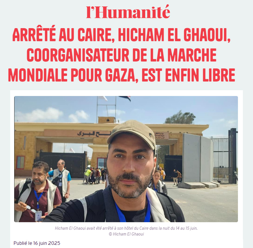 Arrêté au Caire, Hicham El Ghaoui, coorganisateur de la marche mondiale pour Gaza, est enfin libre