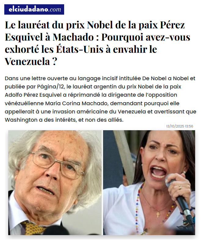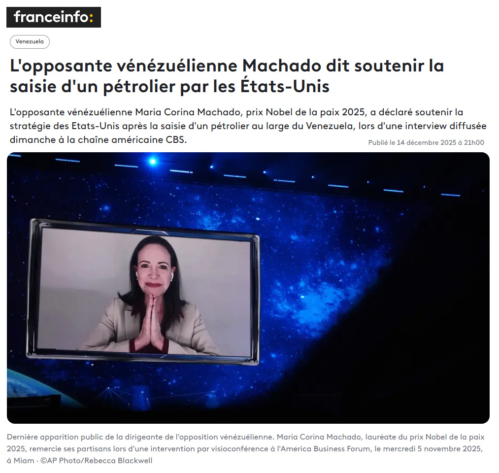 - L’Institut de recherche sur la paix d’Oslo (PRIO) a confirmé que Machado avait « appelé à une intervention militaire au Venezuela ».