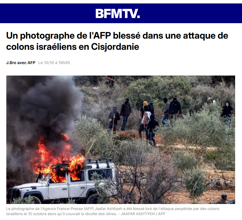 « En trente ans de carrière, c’est la première fois que je fais face à une violence de cette sorte », a déclaré Jaafar Ashtiyeh, photographe palestinien basé à Naplouse, dans le nord de la Cisjordanie, territoire palestinien occupé par Israël depuis 1967. « Si je n’étais pas parvenu à m’échapper, ils m’auraient tué », a-t-il ajouté.
