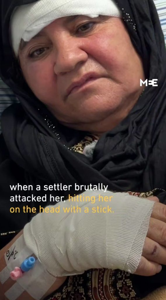 Assise sur un lit d’hôpital, des bandages autour du bras et de la tête, Afaf Saleh Abu Alia raconte amèrement le moment où des colons israéliens l’ont violemment battue alors qu’elle et sa famille cueillaient des olives à Turmus Ayya dimanche.