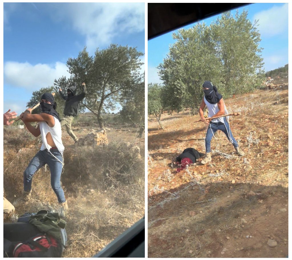 Un colon masqué frappe une femme âgée en train de récolter des olives au nord de Ramallah. Le journaliste américain Jasper Nathaniel, qui a documenté l’agression, a déclaré que l’armée israélienne avait conduit les villageois dans « une embuscade brutale tendue par des colons armés ».