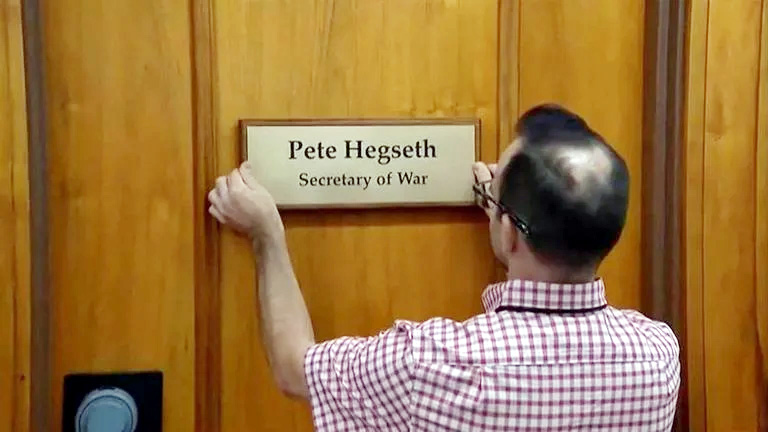 La nouvelle plaque devant le bureau de Pete Hegseth. Le 5 septembre 2025 , le président américain a signé un décret transformant le département de la défense en département de la guerre