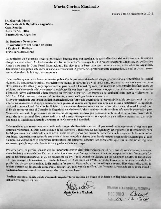 Courrier de Maria Corina Machado à Mauricio Macri et Benyamin Netanyahou « La nature criminelle [du régime], étroitement lié au narcotrafic et au terrorisme, représente une menace réelle pour les autres pays, parmi lesquels, très particulièrement, Israël ».