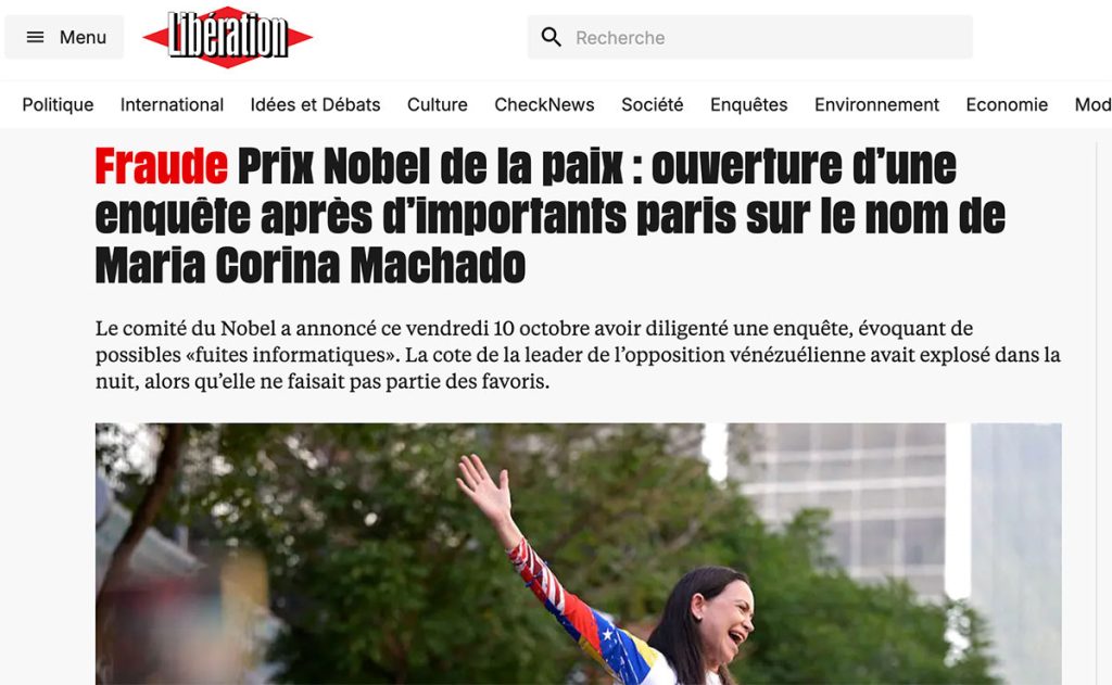 « Je suis en état de choc, je n’arrive pas à y croire », a confié María Corina Machado en apprenant sa nomination. Elle n’est pas la seule. Partout, ceux qui ont encore une cervelle se désolent, s’emportent, vomissent, serrent les poings, crachent leur colère et leur indignation. Même Trump exprime sa stupéfaction. Quelques minutes après l’attribution du prix à (celle dont on ne sait pas si elle va demeurer) son amie, il a affirmé que le comité avait fait passer « la politique avant la paix ».