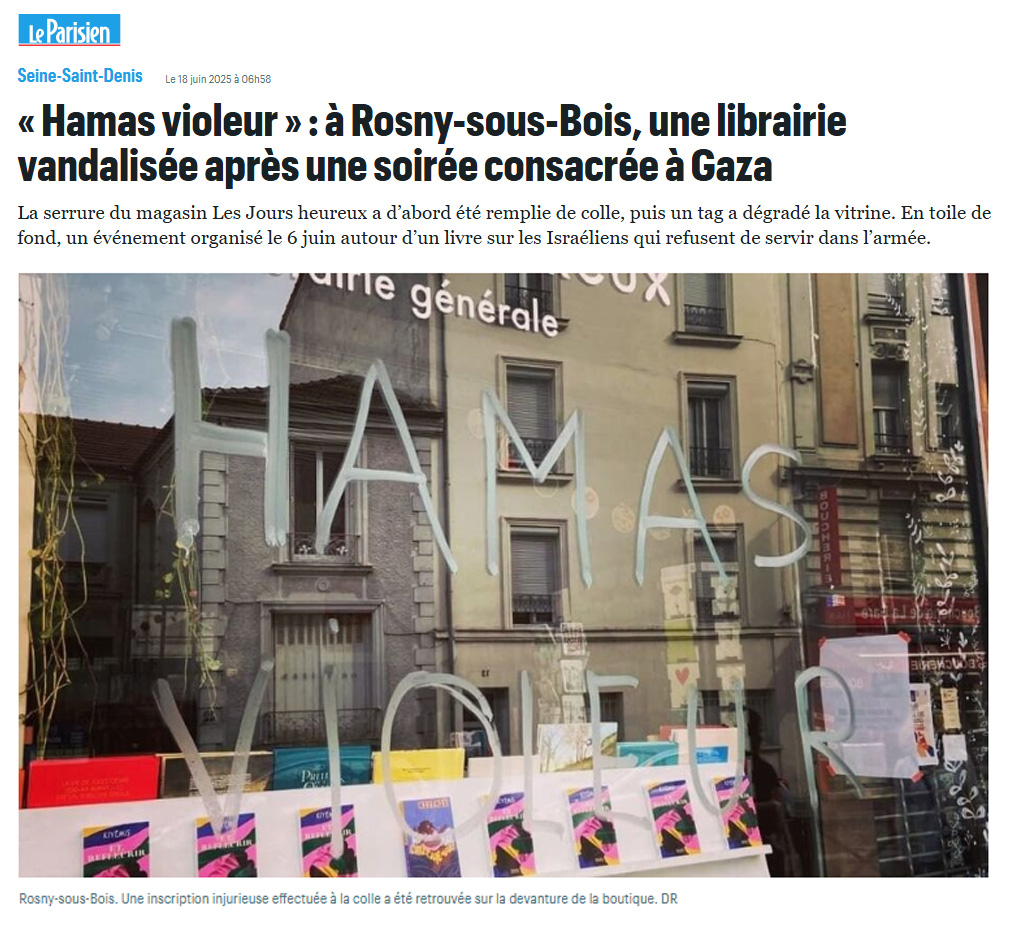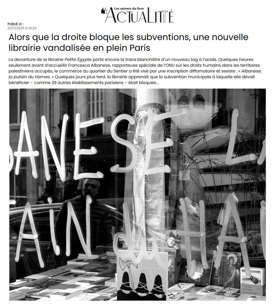 La Petite Égypte (Paris). Alors qu’une rencontre est prévue le soir avec Francesca Albanese, la rapporteuse de l’ONU sur les territoires palestiniens, la devanture est taguée du message : « Albanese la putain du Hamas », accompagné d’une étoile de David. « Le tout réalisé avec une peinture contenant une substance corrosive qui ronge le verre ».