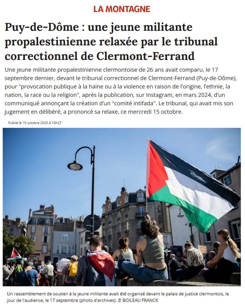 Une militante était poursuivie pour « provocation à la haine et à la violence contre la population juive » après avoir diffusé sur Instagram un communiqué du « Collectif Intifada » soutenant la résistance palestinienne, y compris armée, et appelant à des actions contre les institutions locales liées au sionisme.