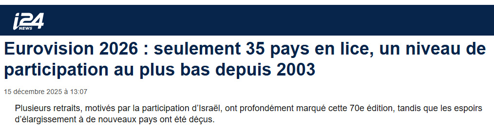 i24 news, la chaîne d’information israélienne, constate ainsi une participation historiquement basse puisque seuls 35 pays prendront part à l’Eurovision 2026, le plus faible nombre depuis 2003.