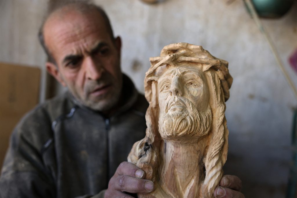 Un Palestinien montre une figure du Christ qu’il a sculptée dans son atelier dans la ville biblique de Bethléem, en Cisjordanie occupée, le 18 décembre 2025 (AFP)