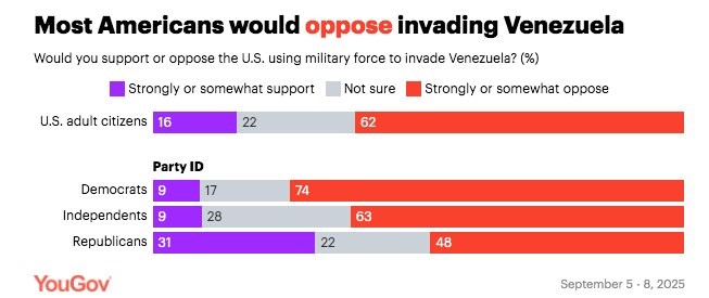 D’après un sondage YouGov publié le 31 octobre, les Américains sont réticents à soutenir un déploiement naval autour du Venezuela. Ils sont davantage enclins à rejeter qu’à approuver des attaques militaires contre des vedettes rapides et des cibles terrestres. L’opposition au renversement violent du président Maduro s’intensifie.