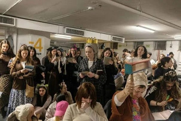 [Des Israéliennes célèbrent Pourim dans un parking servant d’abri anti-bombes à Tel Aviv lundi. Photo Itay Ron.]
