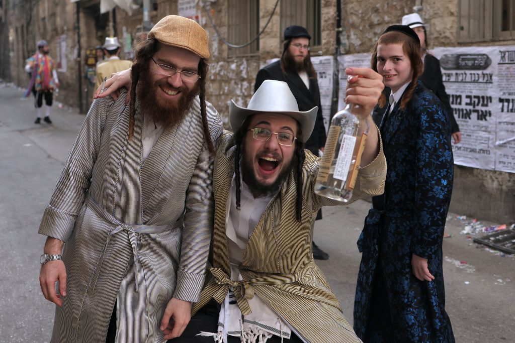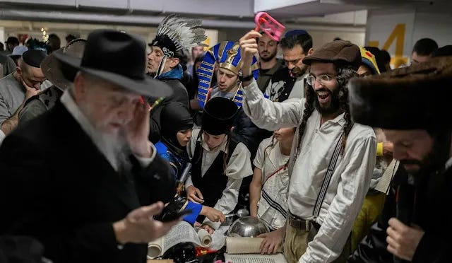 [Des hommes juifs ultra-orthodoxes célèbrent mercredi la fête de Pourim à Jérusalem, en pleine guerre contre l’Iran. Photo Ohad Zwigenberg/AP.]