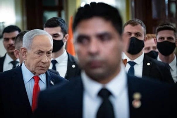 [Netanyahu encadré par ses gardes du corps, la semaine dernière. Photo Yonathan Zindel/Flash90.]