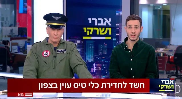 [Avri Gilad déguisé en pilote de l’armée de l’air lors d’un journal télévisé de la chaîne 12 sur la guerre contre l’Iran. Capture d’écran de la chaîne 12.]