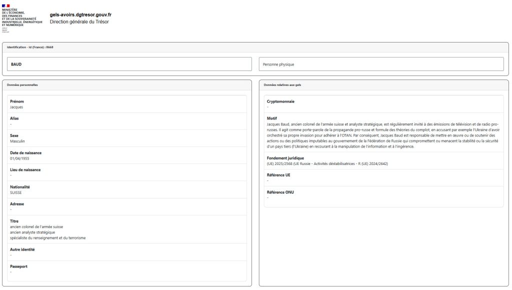 Ministère de l’Économie et des finances : Fiche concernant Jacques Baud issue du registre national des gels d’avoirs