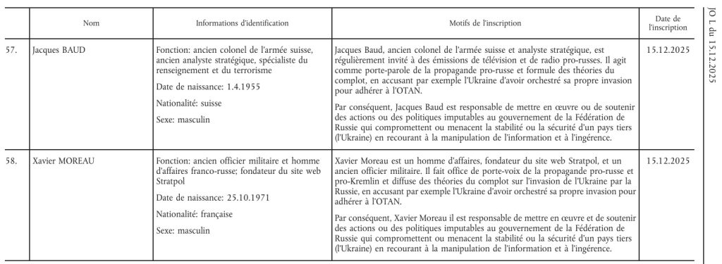 Conseil de l’Union Européenne : Liste des personnes sanctionnées par décision du 15 décembre 2025