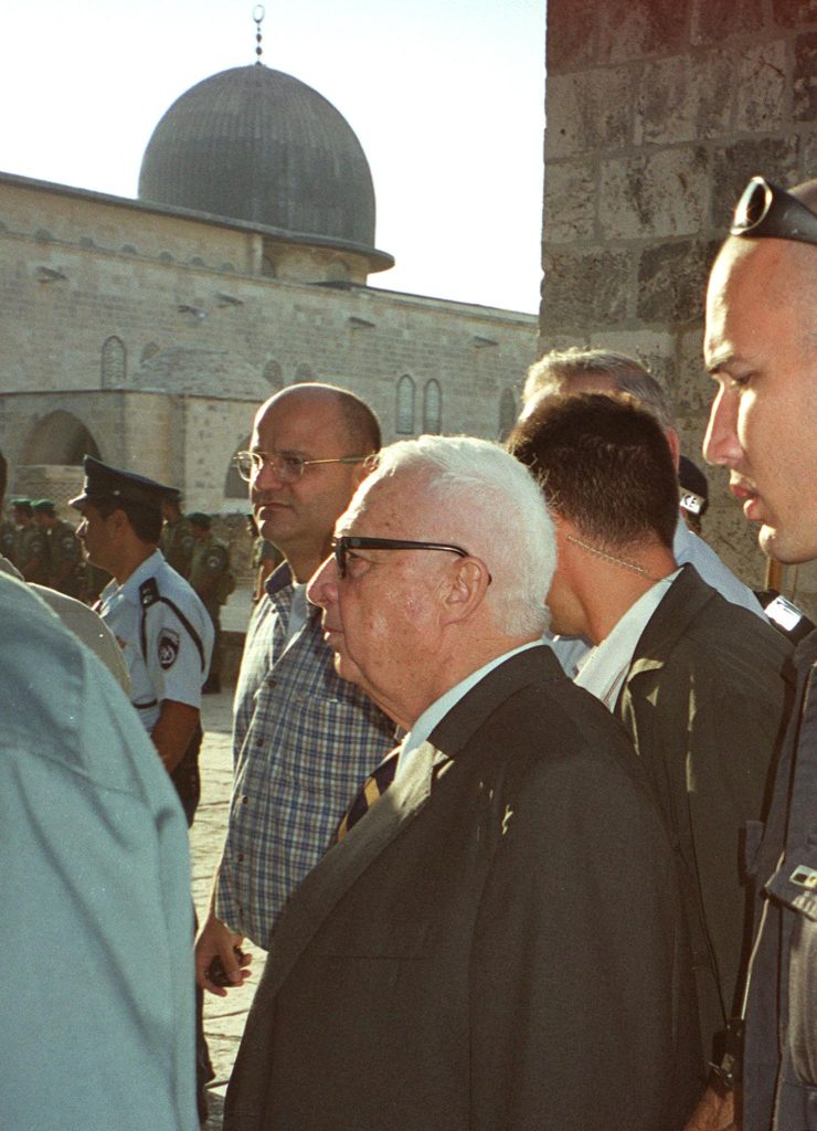 Ariel Sharon est flanqué de gardes de sécurité alors qu’il quitte l’esplanade de la mosquée Al-Aqsa dans la vieille ville de Jérusalem, le 28 septembre 2000. Quelque 29 personnes ont été blessées lorsque la police israélienne a tiré sur des Palestiniens qui lançaient des pierres pour protester contre la visite de Sharon au troisième sanctuaire le plus saint de l’islam. Au moins quatre Palestiniens ont été touchés par des balles en caoutchouc tandis que 25 policiers ont été blessés par des pierres. (AFP)