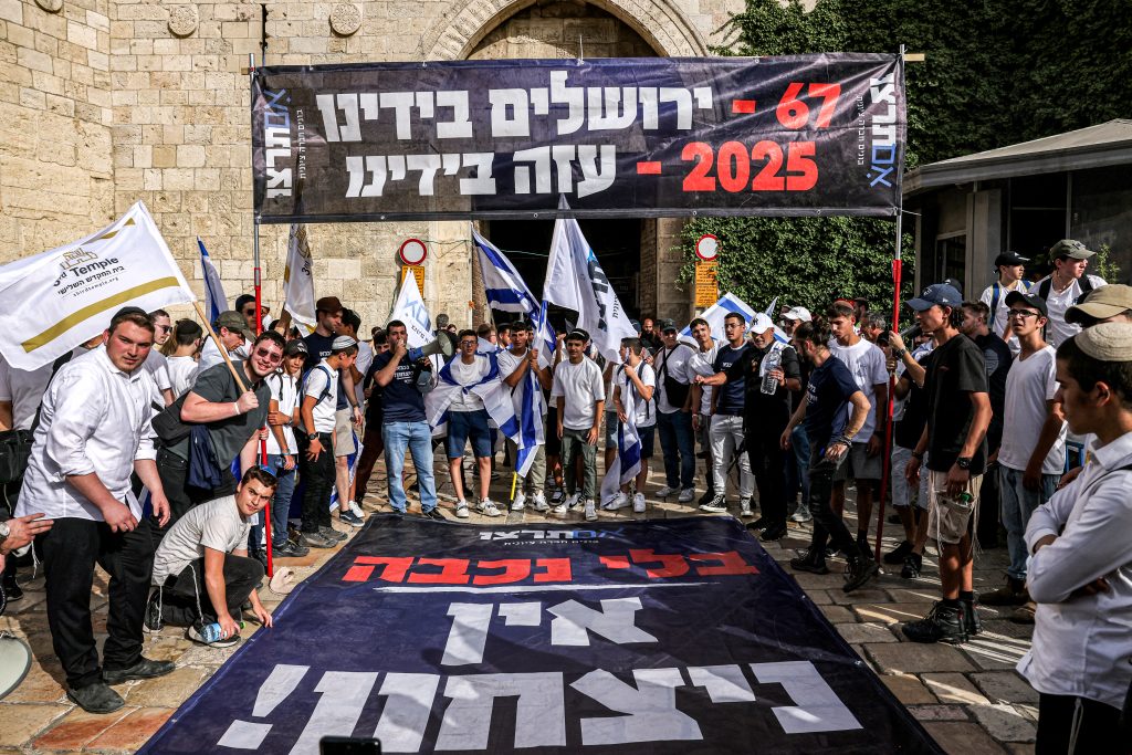 Des militants de droite brandissent une banderole sur laquelle on peut lire en hébreu : « 67 – Jérusalem entre nos mains ; 2025 – Gaza entre nos mains » alors qu’ils se rassemblent avec des drapeaux israéliens devant la porte de Damas de la vieille ville fortifiée de Jérusalem, le 26 mai 2025, lors d’une marche des drapeaux pour la Journée de Jérusalem, commémorant la capture du secteur oriental de la ville par l’armée israélienne en 1967 pendant la guerre israélo-arabe. (AFP)