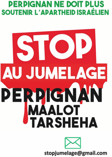 Depuis 1998, la ville de Perpignan est jumelée avec Maalot-Tarshiha, une municipalité israélienne. Ce jumelage, présenté comme un échange "culturel", est en réalité une caution politique à un régime colonial et raciste. En maintenant ce lien, la municipalité de Perpignan se rend complice de l'apartheid pratique par l'Etat d'Israël contre le peuple palestinien.