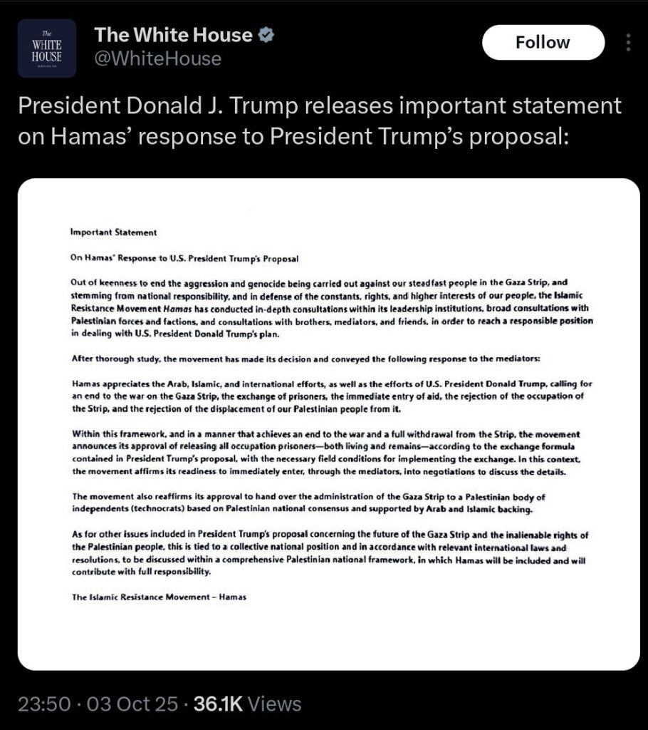 - Dans un souci de mettre fin à l’agression et au génocide perpétrés contre notre peuple inébranlable dans la bande de Gaza, par sens des responsabilités nationales et pour la défense des constantes, des droits et des intérêts supérieurs de notre peuple, le Mouvement de la Résistance Islamique Hamas a mené des consultations approfondies au sein de ses institutions dirigeantes, des consultations élargies avec les forces et factions palestiniennes, ainsi que des consultations avec des frères, médiateurs et amis, afin d’adopter une position responsable face au plan du président des États-Unis, Donald Trump.